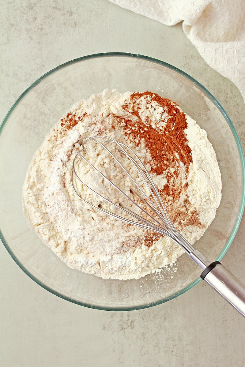 Flour, baking powder, baking soda, salt, cinnamon and nutmeg go into a bowl first, then a quick whisk combines everything evenly.