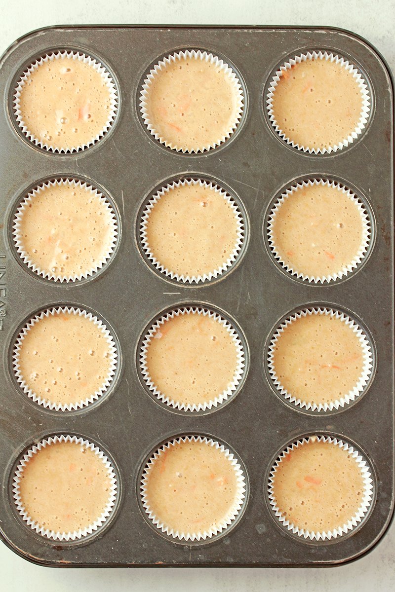 - Divide the batter evenly among 12 cupcake liners, filling each about two-thirds full.