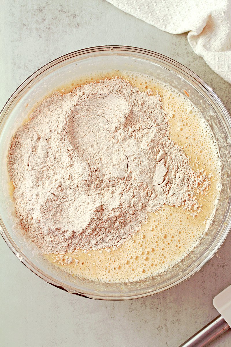 Once both mixtures are ready, pour the dry ingredients in and gently stir just until a soft batter forms.