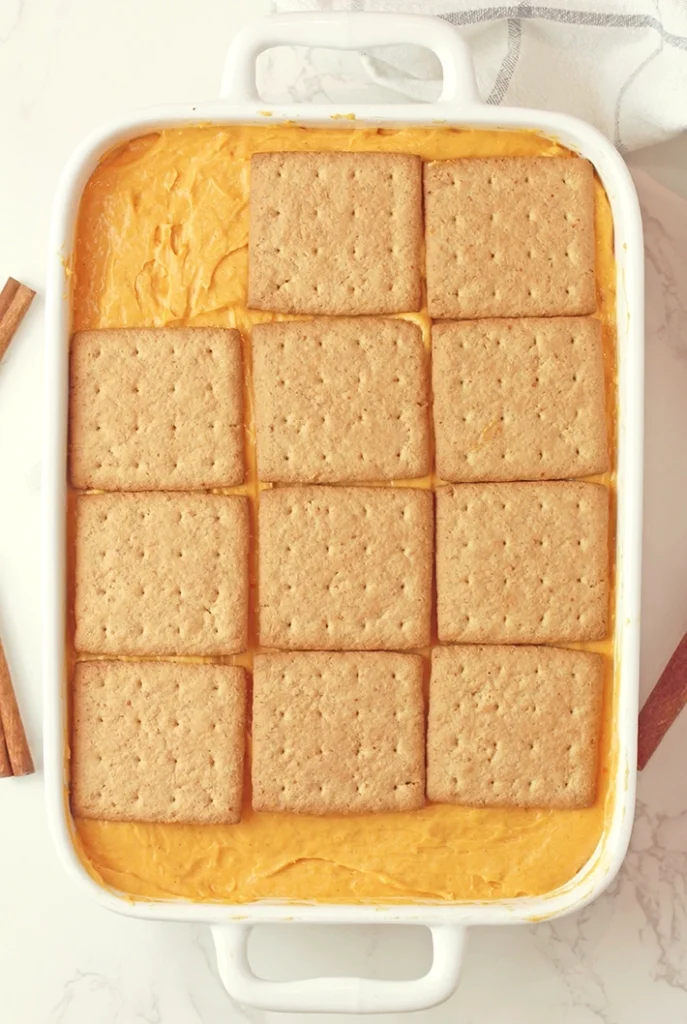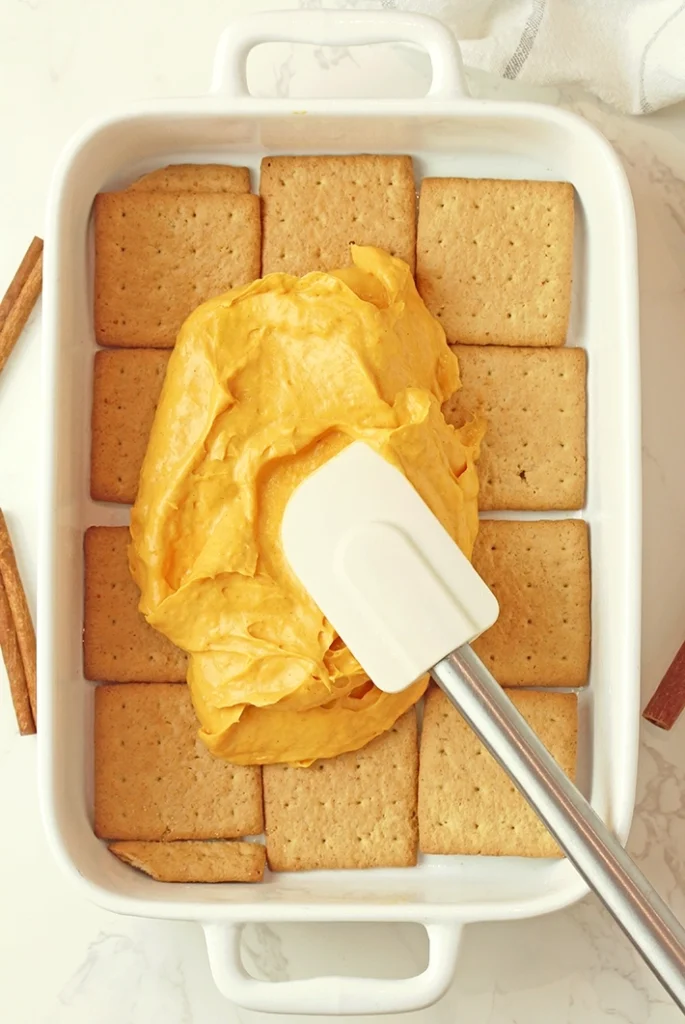 2. Add another layer of graham crackers, then spread the remaining pumpkin filling over them, again spreading to the edges. Finish with a final layer of graham crackers.