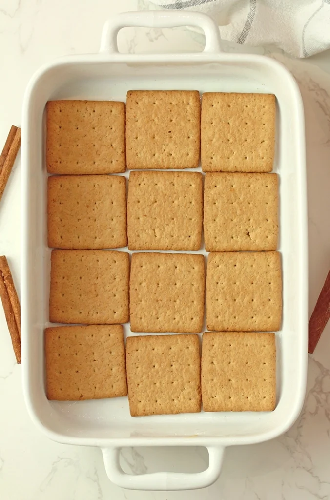 Generously spray your dish with cooking spray so the graham crackers don’t stick to the bottom – this makes it much easier to remove the dessert from the pan.