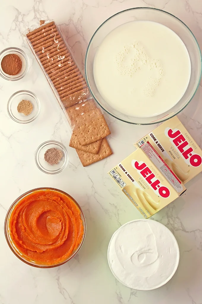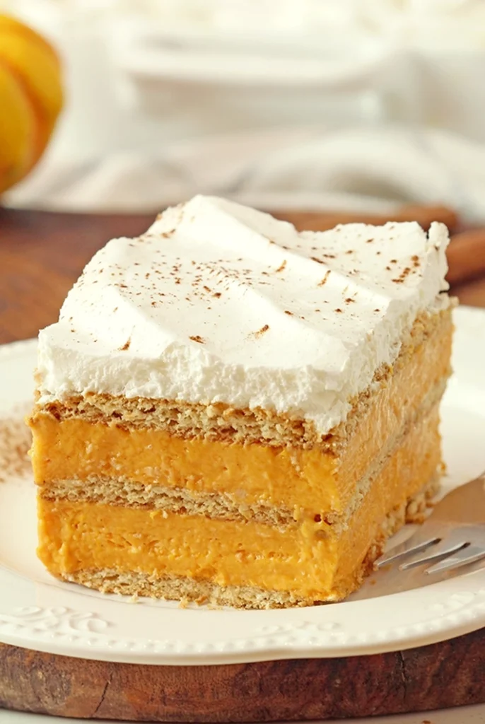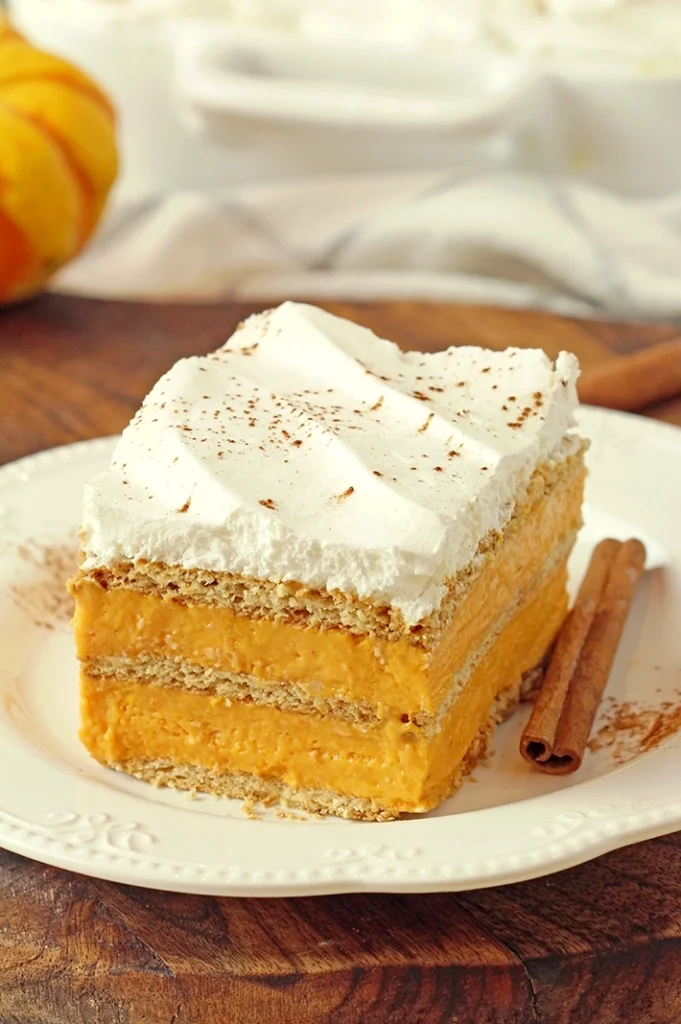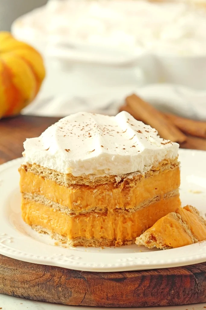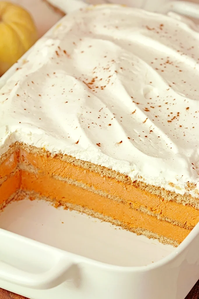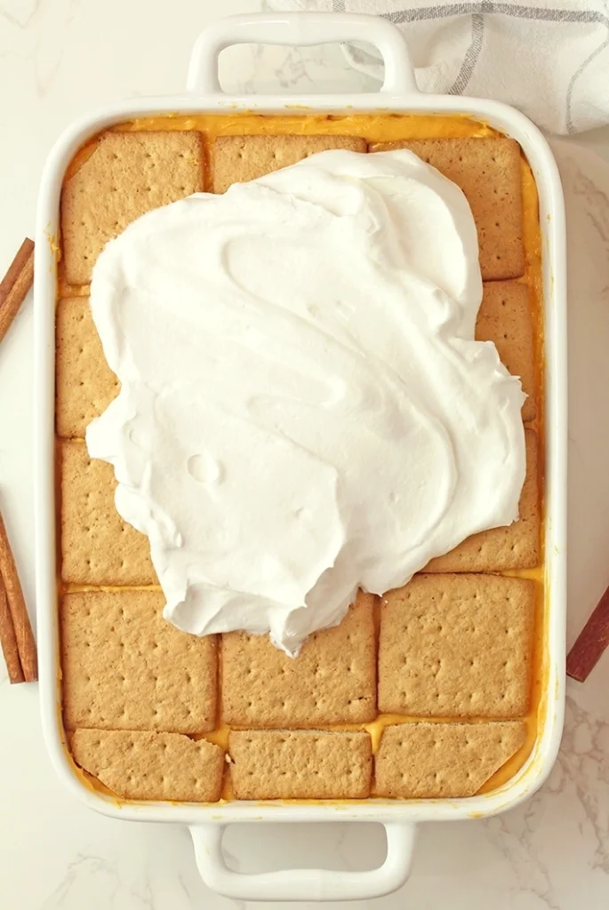 Line the bottom of a 9×13-inch dish with a layer of graham crackers. Spread half of the pumpkin filling over the top. Add another layer of graham crackers, then spread the remaining pumpkin filling. Finish with a final layer of graham crackers. Top with the remaining whipped topping.