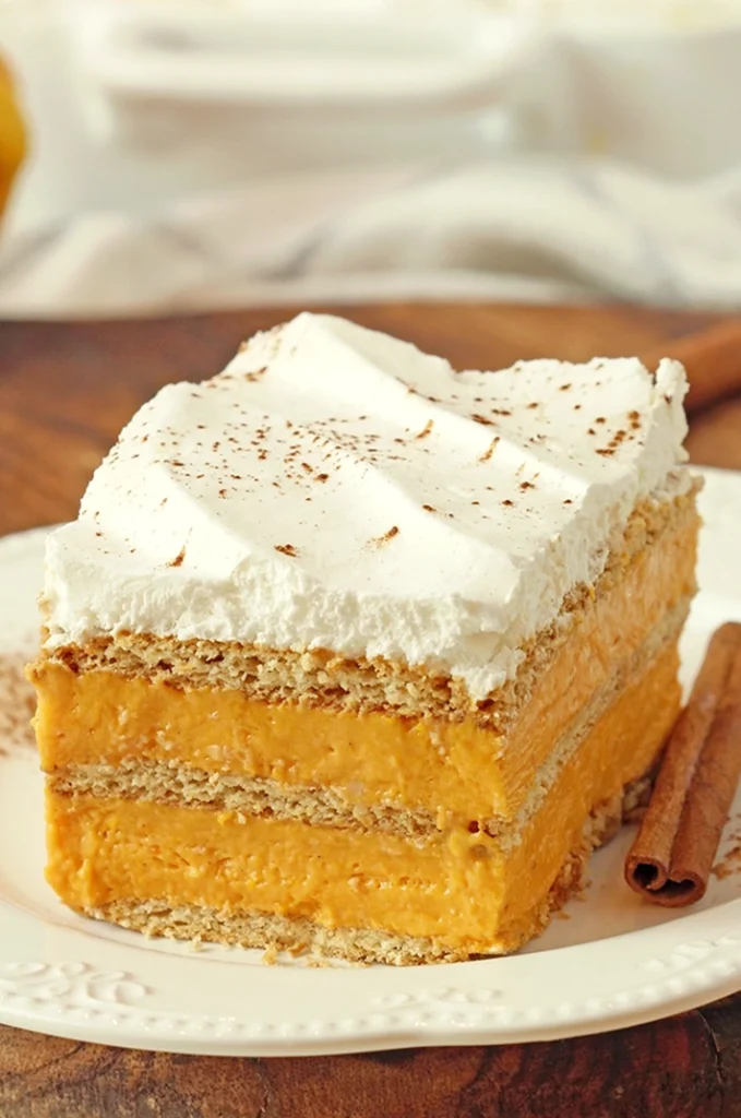 This quick and easy No-bake Pumpkin Eclair Cake, made with layers of graham crackers and rich layers of pumpkin filling , topped with whipped topping, is the perfect fall dessert! Ready in only 10 minutes plus chill time, it’s great for gatherings and holidays - especially Thanksgiving.